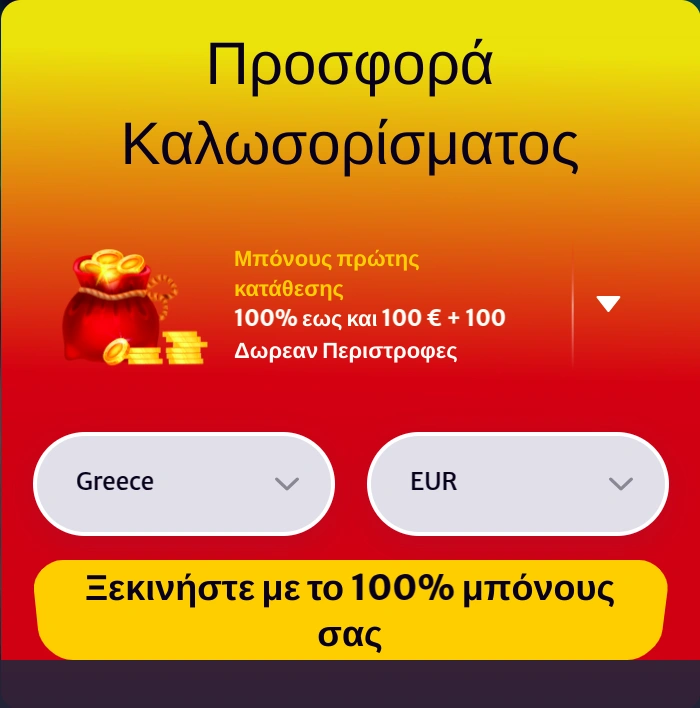 | Μπόνους Πρώτης Κατάθεσης | 100% έως €100 + 100 δωρεάν περιστροφές | €20 | 100 δωρεάν περιστροφές πιστώνονται ως 20/ημέρα |